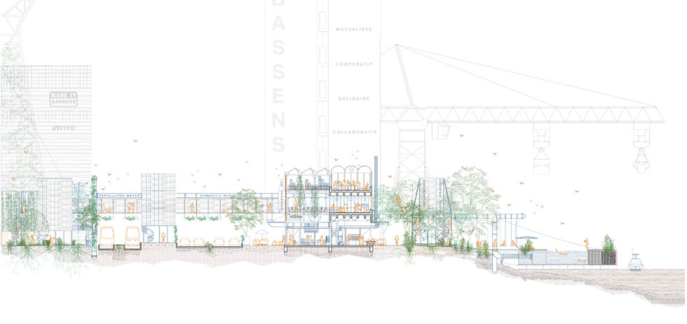 La situation de l'Anthropocène est critique, mais pas perdue. Bassens représente un moyen de reconstruire une société plus durable, attractive et inclusive. Au carrefour des infrastructures biotiques et abiotiques, le territoire industrialo-portuaire a le potentiel de transcender une économie de propriété en une économie d'usage, à travers la richesse foncière et les infrastructures logistiques. Pour repenser une Gaïa urbanisée, nous devons réintégrer l'intelligence collaborative dans les systèmes humains et naturels. Le résultat est une économie symbiotique où chaque élément est évalué pour le potentiel qu'il porte plutôt que pour sa valeur immédiate. SYMBIOTIQUE BOOM! recherche la résilience. Par hybridation fonctionnelle, ce qui est déjà là peut devenir accueillant. Avec le « droit d'usage », les citoyens sont solidaires pour reconstruire un capital social.